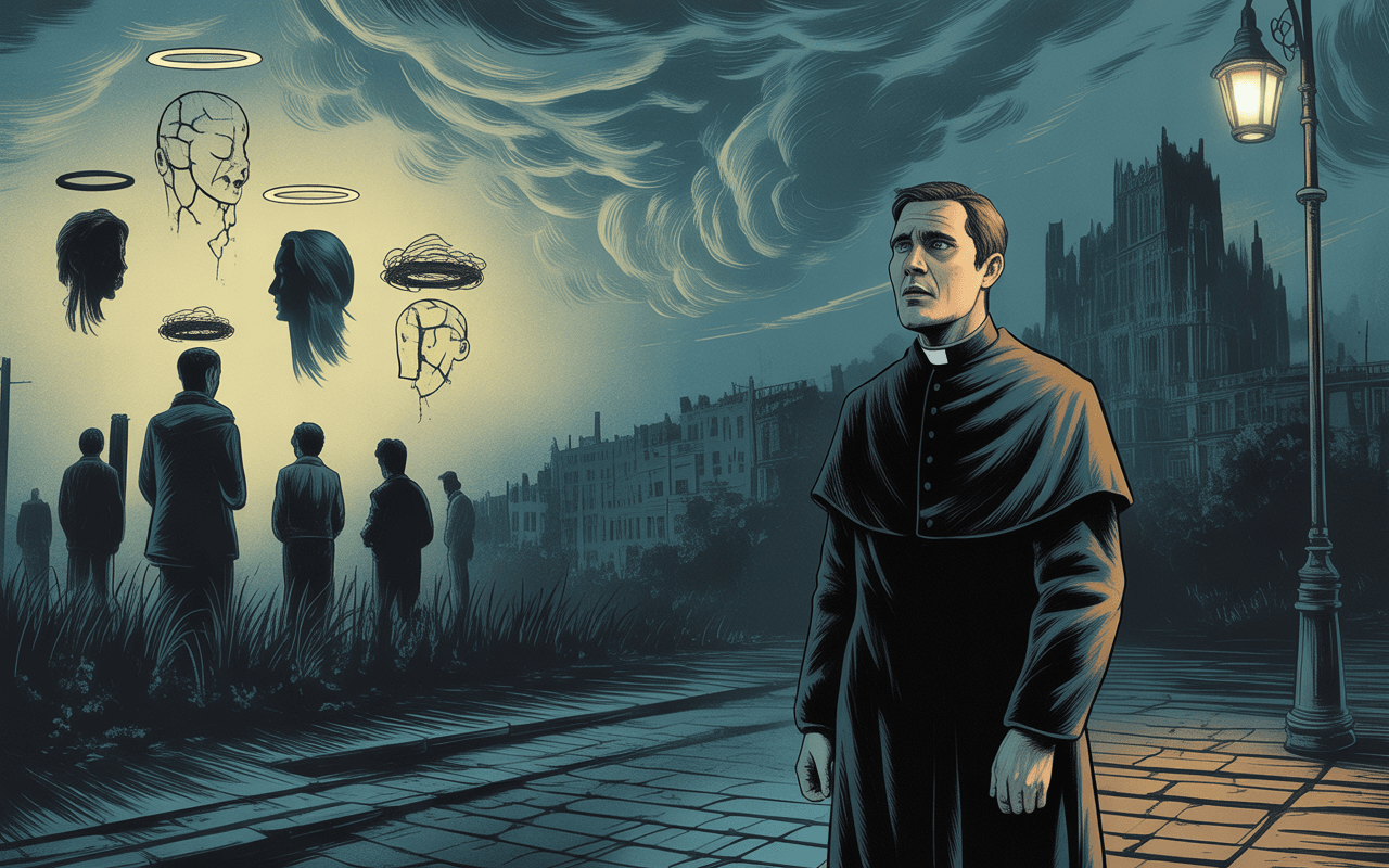 The first halo appeared three days after Father Gabriel Santi died for ninety-two seconds. It hovered, faint but undeniable, above the head of a boy loitering outside the metro station—an ethereal ring of light, not gold or silver, but a dull, bone-colored glow like something half-buried in ash. The boy was smoking a cigarette and watching people with eyes too sharp for his age. His halo had a crack down the center, black and jagged, pulsing faintly like a wound that refused to close
