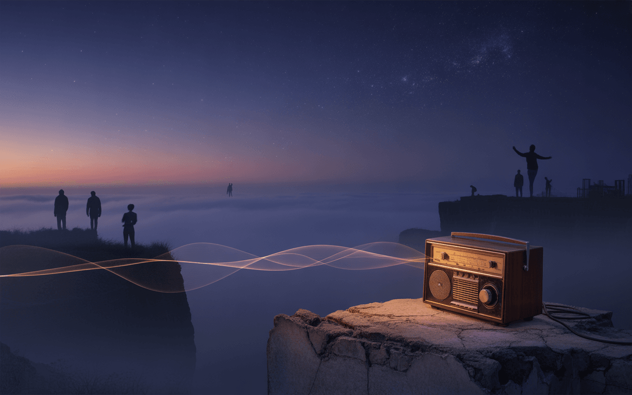 The crackling static filled the small, dimly lit room, a fragile thread stretching across a fractured world. From somewhere deep within the ruins of a once-thriving city, the faint voice of the last radio DJ echoed through the broken airwaves — a solitary beacon in a vast sea of silence.